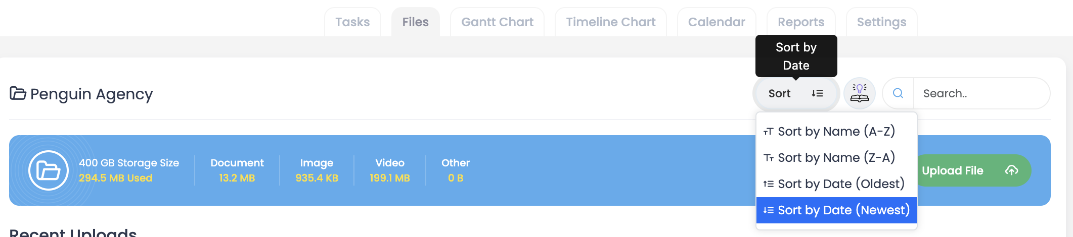 You can use the Files page to save files and folders related to the project. Each file includes size information, as well as its upload date and time in its details.&#x20;