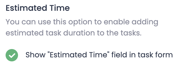 To avoid wasting unnecessary time, you can add an **Estimated Time** field to the task form. This option is available under the **Estimated Time** field in the **Details** tab of the project's settings page.