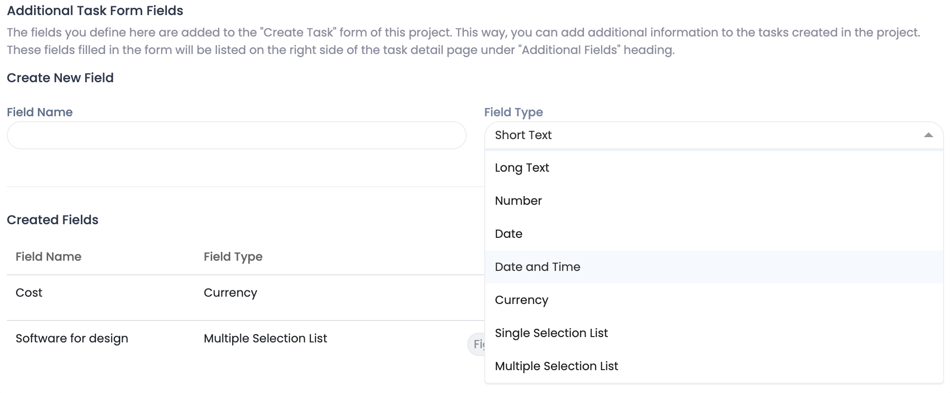 The default task creation form includes fields such as name, description, start and due dates, assignees, client, and tags. If you wish, you can make tasks more detailed by adding additional fields to the task form. This can be done from the **Additional Task Form Fields** section under the **Details** tab of the project's settings page.