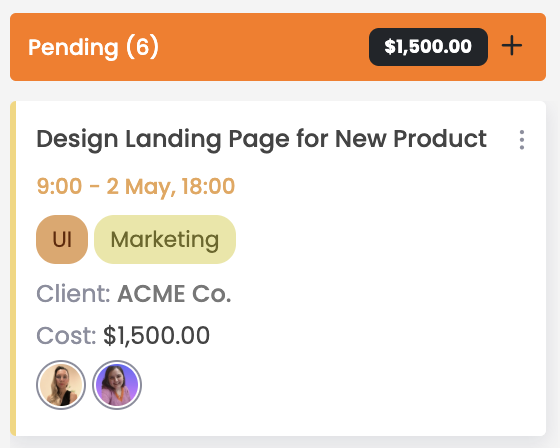 **Note:** If the additional field selected for the **Kanban** view is of the **Number** or **Currency** type, the sum of the values entered in the tasks will be displayed next to the task status. For example, if there are three tasks under the **Pending** stage with expenses of $10000, $5000, and $30000, the total of $45000 will be shown next to the **Pending** status. This feature is especially useful for teams tracking costs, as it provides an easy way to monitor the project's budget and expenses at each stage. Seeing the total values helps project managers understand how much work is still pending and the costs incurred at each stage of the project.