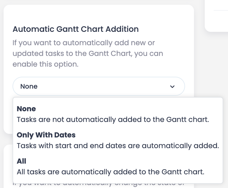 You can choose to have newly created tasks added to the Gantt Chart automatically. This setting is available under Project Settings > Details. You can decide whether only tasks with dates should be added or if all tasks should appear on the Gantt Chart.