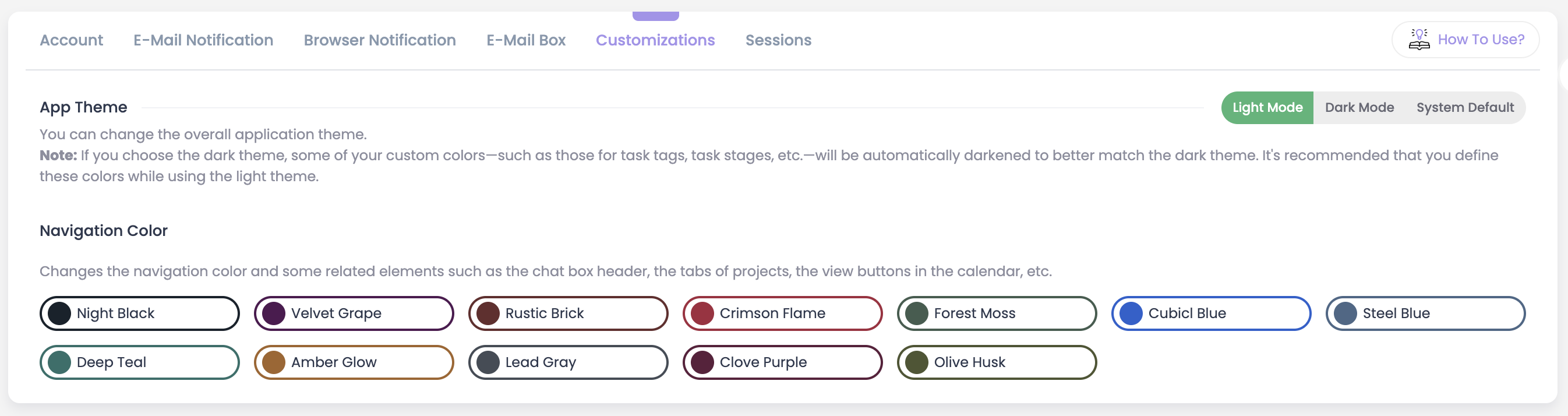 You can customize your Cubicl experience—such as choosing light or dark mode or adjusting interface colors—through the Customization section on your Profile page.